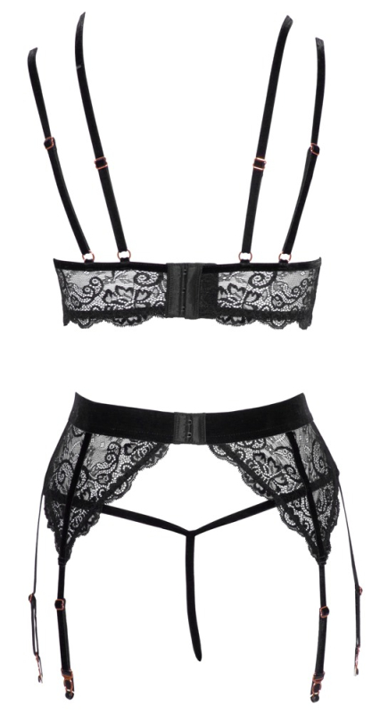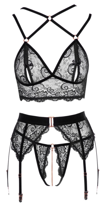 Edle Spitze mit raffinierten Details! BH, Strapsgurt und String ouvert von Abierta Fina aus edler schwarzer Stretch-Spitze mit Samtdetails und roségoldfarbenen Accessoires. Der BH ist länger geschnitten und mit kleinen Hakenverschlüssen unter den Satin-Schleifchen an den geschlitzten Cups versehen, auch im Rücken befindet sich ein Hakenverschluss. Die verstellbaren Samt-Doppelträger kreuzen sich über dem Dekolleté und verlaufen hinten als 4-fache Träger. Der Strapsgurt hat ein Samtbund mit dekorativem Ring vorne und hinten ebenfalls einen Hakenverschluss - die 6 Strumpfhalter sind verstellbar. Der dazu passende String hat im komplett offenen Schritt eine abnehmbare Schrittkette.