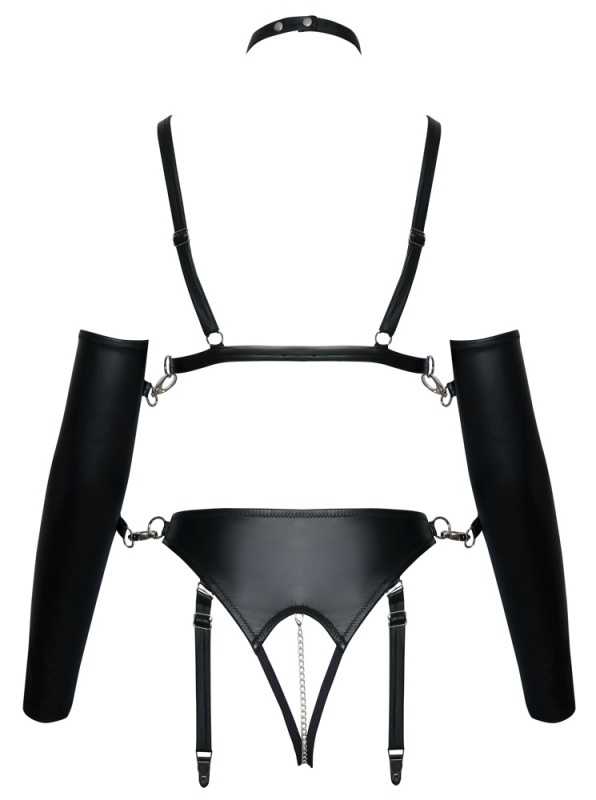 Ouvert-Set von Bad Kitty mit busenfreiem Riemen-BH, schrittoffenem Straps-Slip, Halsband und 2 Fessel-Armstulpen. Im schwarzen stilvollen Mattlook mit silberfarbenen Accessoires. Weich und elastisch für hohen Tragekomfort. BH-Träger passend verstellbar. Straps-Slip mit verstellbaren Strumpfhaltern, die auch komplett abnehmbar sind. Genauso wie die Karabinerkette im offenen Schritt. Schmales Halsband mit Ring vorne und verstellbarem Druckknopfverschluss im Nacken. Seitlich in die Ringe von BH und Slip können für softe Bondagespiele die beiliegenden Fessel-Armstulpen mit ihren Karabinerhaken befestigt werden.