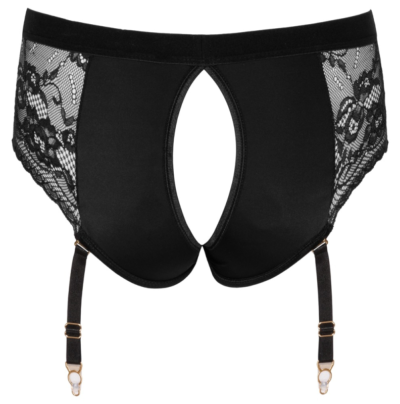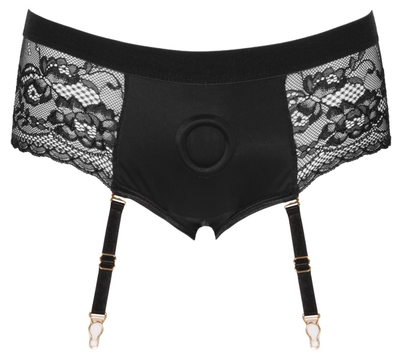 Eleganter komfortabler Style für stoßfreudige Momente! Schwarze Strap-on-Panties von Bad Kitty im weichen elastischen Material-Mix aus Mikrofaser und Spitze. Vorne doppellagig mit Einschub gearbeitet und mit sorgfältig eingearbeitetem Stretch-Haltering (Ø 3,5 cm) zum Einsetzen eines Dildo/Vibrators mit Stand-/Saugfuß. Über dem Po mit einladendem Cut-out. Die Strumpfhalter sind verstell- und auch komplett abnehmbar.