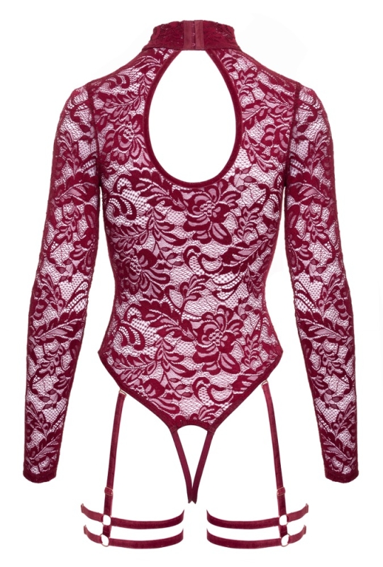 Burgundy-roter Langarm-Body von Abierta Fina mit Straps-Harness. Aus weicher Stretch-Blütenspitze verführerisch in Szene gesetzt mit Samt-Details und roségoldfarbenen Schmuckketten. Rundum weich und elastisch anschmiegsam für hohen Tragekomfort. Im zeigefreudigen Ouvert-Style mit Cut-outs für die Brüste und einladend offenem Schritt. Im Rücken verführt der Spitzenbody zusätzlich mit einem schönen runden Ausschnitt. Die Herz-Schmuckkette vorne am Stehkragen (mit Hakenverschluss) ist abnehmbar, genauso wie die Karabinerkette an den Ringen unter den Brüsten. Auch die verstellbaren Strapse und Schenkelbänder sind vom Spitzenbody abnehmbar.