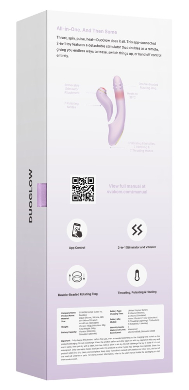 DuoGlow – 2 Toys, 1 Mission: Maximales Vergnügen! Der DuoGlow von SVAKOM kombiniert einen stoßenden Perlenvibrator und einen pulsierenden Stimulator in einem einzigartigen zweiteiligen Design. Vibrator und abnehmbarer Stimulator (Fernbedienung) lassen sich vielseitig beim intimen Spiel einsetzen – allein oder zu zweit. Entweder als kombiniertes Toy für gleichzeitige vaginale und klitorale Stimulation. Oder einzeln, wobei der Pulsator-Stimulator auch als eigenständige Fernbedienung für den Vibrator verwendet werden kann.