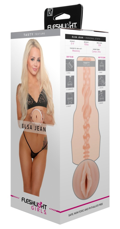 Erste Sahne-Vergnügen mit intensiver Reizstruktur! Griffiger Masturbator Elsa Jean Tasty von Fleshlight in diskreter Taschenlampen-Optik mit original abgeformter Vagina-Öffnung von Erotikstar Elsa Jean. Und auch das sehr abwechslungsreich strukturierte Innenleben mit verschiedenen Durchmessern kommt der engen Vagina von Elsa ganz nah und sorgt für eine intensive, orgasmuswirksame Massage beim Handjob. Die Innensleeve aus hautähnlichem super softem Material ist neben der Öffnung mit einem Autogramm von Elsa versehen und lässt sich zur Reinigung leicht aus dem Masturbator entnehmen.
