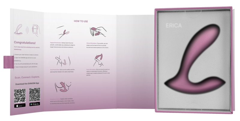 Interaktives Vibro-Vergnügen! Wiederaufladbarer, wasserdichter Panty-Vibrator Erica von SVAKOM im ergonomischen Design, um gleichzeitig Vagina/G-Punkt und Vulva/Klitoris zu stimulieren. Ganz diskret und leise – niemand bemerkt das kleine Lust-Geheimnis! Der seidig softe, sanft strukturierte Silikon-Vibrator passt sich flexibel dem Körper und den Bewegungen perfekt an. Für höchsten Trage- und Verwöhnkomfort!