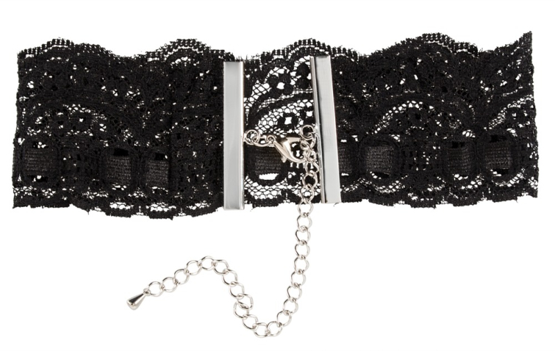Schwarzes Spitzen-Halsband mit Ketten/Karabinerverschluss - mehrfach verstellbar.