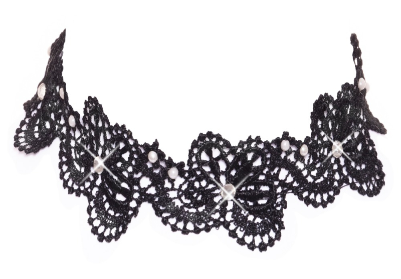 Zartes Highlight für jeden Style! Schwarzes Halsband von Cottelli ACCESSOIRES aus filigraner Stickerei in Spitzenoptik. Verziert mit Perlen und schillernden Glitzersteinchen. Weiche anschmiegsame 3 cm breit/hoch. Im Nacken mit individuell verstellbarer Satin-Bindeschleife.