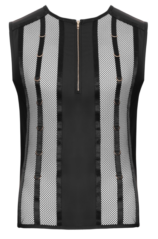 Ärmelloses schwarzes Shirt von Svenjoyment aus zeigefreudigem Netzmaterial im Mix mit angesagtem Wetlook. Rundum elastisch und hautnah weich anschmiegsam für hohen Tragekomfort. Mit goldfarbenem kurzem Front-Reißverschluss vorne. Dazu dekorative goldfarbene Ringe jeweils vorne seitlich und hinten im oberen Rücken.
