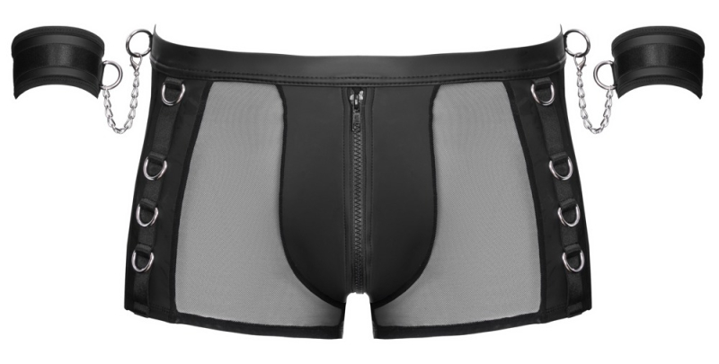 Schwarze Pants von Svenjoyment Bondage inklusive Soft-Handfesseln. Aufregend po-freie Pants im coolen Material-Mix aus Netz und Mattlook mit silberfarbenen Metalldetails. Weich und elastisch für besten Tragekomfort. Mit Reißverschluss im Beutel. Am bezogenen Bund und jeweils seitlich Fesselringe, in die die beiliegenden Handfesseln mit ihren Karabinerketten schnell eingehakt sind. Die soften Mattlook-Manschetten sind mit Klettverschlüssen schnell angelegt und angepasst.