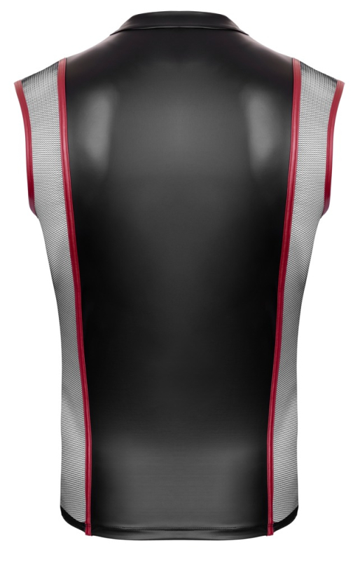 Ärmelloses Shirt von NEK in körpernaher Schnittführung. Cooler schwarzer Mattlook mit roten Kontraststreifen und silberfarbenen Details. Mit seitlichen Netz-Einsätzen und kurzem Front-Reißverschluss. Kleiner Stehkragen mit dekorativen Ringen vorne. Rundum weich und elastisch für besten Tragekomfort.