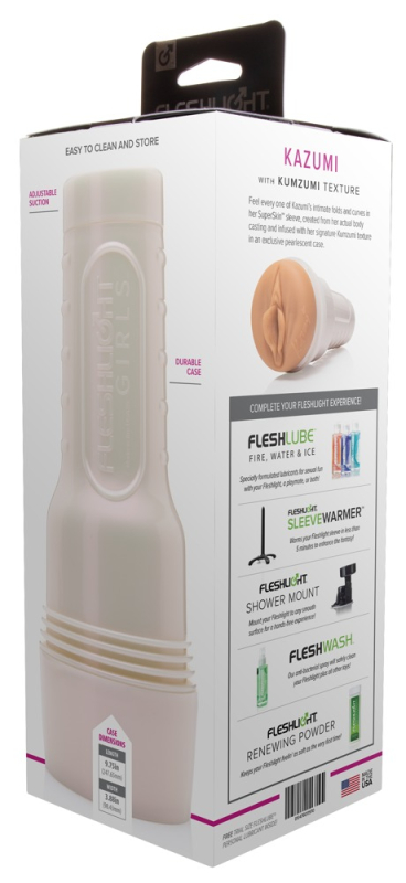 Erste Sahne-Vergnügen mit intensiver Reizstruktur! Griffiger Masturbator Kazumi von Fleshlight in diskreter Taschenlampen-Optik mit original abgeformter Vagina-Öffnung von Erotikstar Kazumi. Und auch das sehr abwechslungsreich strukturierte Innenleben mit verschiedenen Durchmessern kommt der engen Vagina von Kazumi ganz nah und sorgt für eine intensive, orgasmuswirksame Massage beim Handjob. Die Innensleeve aus hautähnlichem super softem Material ist neben der Öffnung mit einem Autogramm von Kazumi versehen und lässt sich zur Reinigung leicht aus dem Masturbator entnehmen.