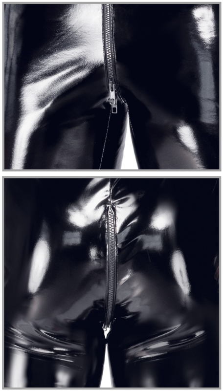 Schwarz-glänzender Lack-Overall von Black Level mit kurzem Arm und Bein. Leicht elastisch für anschmiegsamen Komfort-Sitz. Mit unterlegtem 3-Wege-Reißverschluss vom markanten Stehkragen durch den Schritt bis über den Po.