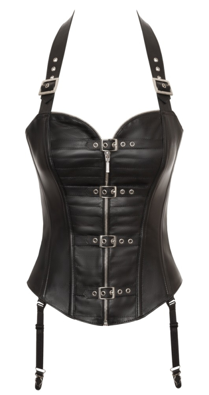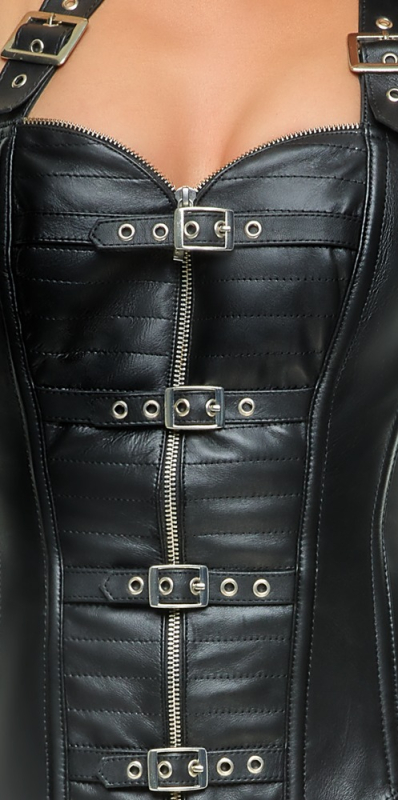 Corsage von ZADO aus Lammnappa-Leder mit Steppung im Biker-Style und Taillenband. In der Front mit durchgehendem Reißverschluss und Schnallen, hinten mit Schnürung - wahlweise blickdicht unterlegt oder "Rücken offen". Träger verstellbar, Strapse verstell- und abnehmbar. Schwarz. Ohne String und Strümpfe.