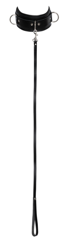 Breite Halsfessel und Leine im schwarzen Leder-Set von ZADO inklusive Schloss mit Schlüsseln. Breite Leder-Fesselmanschette hochwertig gearbeitet mit abgesteppten Kanten. Dazu dick und weich gepolstert für hohen Tragekomfort. Mit Schnallenverschluss passend verstellbar und mit beiliegendem Schloss arretierbar. An 3 stabil eingearbeiteten robusten Ringen ist die Führungsleine mit ihrem Karabinerhaken schnell eingehakt.