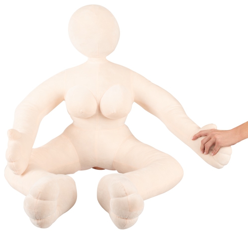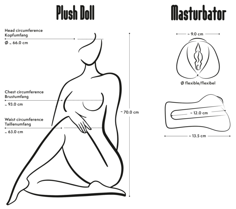 Plush Doll: Sitzend 70 cm groß. Brustumfang 93 cm; Taille 63 cm; Kopfumfang 66 cm. Beine 70 cm lang. Öffnung für Masturbator 16 x 14 cm, mit Kordelzug verstellbar. Gewicht 2.650 g. Polyester, Innenfutter PP-Baumwolle.
