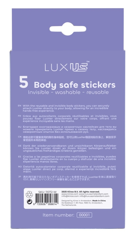 Zubehör für Luxus-Paartoy-Set Die Luxus Adhesive Stickers von Kiiroo halten jeweils den Klitorisvibrator LuxHer vom Paartoy-Set Luxus fest am Hotspot. Der LuxHer-Vibrator wird mit dem Klebepatch einfach direkt auf die (enthaarte) Haut geklebt. So sitzt der Vibrator zuverlässig sicher und rutschfest – in jeder Position und Stellung. Die hautfreundlichen Klebepatches sind wiederverwendbar.