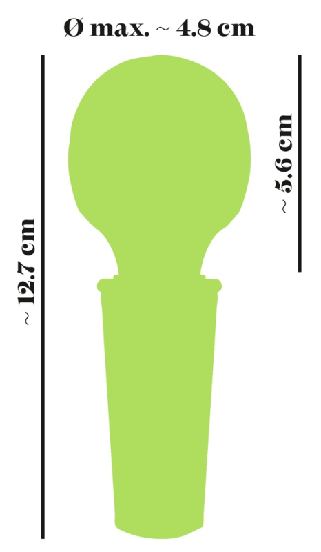 Gesamtlänge 12,7 cm, Massagekopf 5,6 cm lang, Ø max. 4,8 cm. Gewicht 110 g. Silikon, PU, ABS.