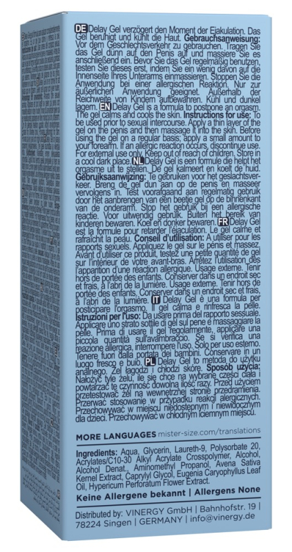 Das Delay Gel von Mister Size unterstützt Männer dabei, ihr Sex-Vergnügen zu verlängern, ohne auf Spontanität oder Gefühl verzichten zu müssen. Das Delay Gel vereint wirksame, natürliche Inhaltsstoffe mit einer hautfreundlichen Formel. Nelkenöl und Laureth-9 können die Empfindlichkeit reduzieren, um den Höhepunkt hinauszuzögern. Gleichzeitig sorgt ein leichter Kühleffekt für zusätzliche Kontrolle, während Johanniskraut- und Haferextrakt die Haut beruhigen. Das leichte Verzögerungsgel lässt sich schnell und gezielt auftragen und ist leicht einmassiert. Es ist kompatibel mit Kondomen und Toys.