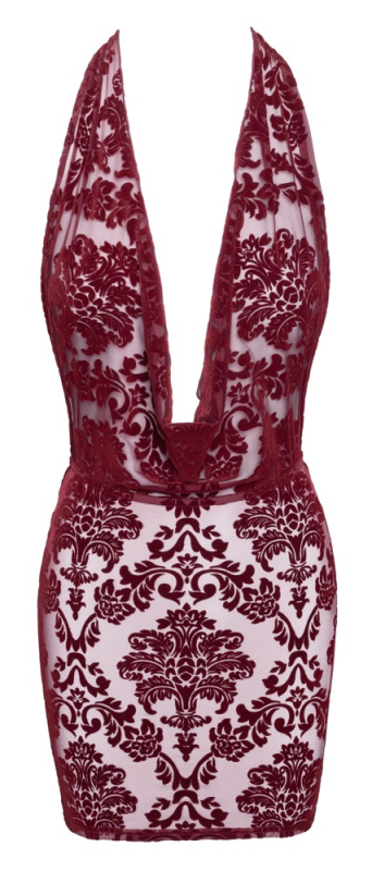 Samtige Transparenz für Diven der Sinnlichkeit! Betonendes Minikleid Kink Royal von Noir in atemberaubender burgundroter Transparenz mit samtigen Flockprint-Ornamenten. Rundum elastisch und weich anschmiegsam für hohen Trage- und Bewegungskomfort. Vorne extra tiefer Wasserfall-Ausschnitt. Mit Neckholder – Schultern und Rücken bleiben aufregend frei.
