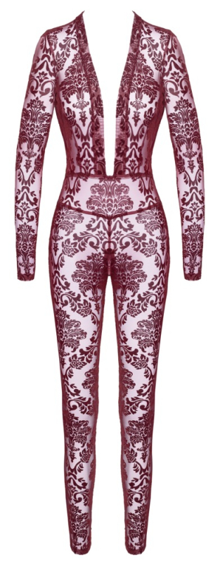 Hautenger Langarm-Overall Kink Royal von Noir in atemberaubender burgundroter Transparenz mit samtigen Flockprint-Ornamenten. Rundum elastisch und weich anschmiegsam für hohen Trage- und Bewegungskomfort. Extra tief dekolletiert und mit diskretem Reißverschluss im Schritt.