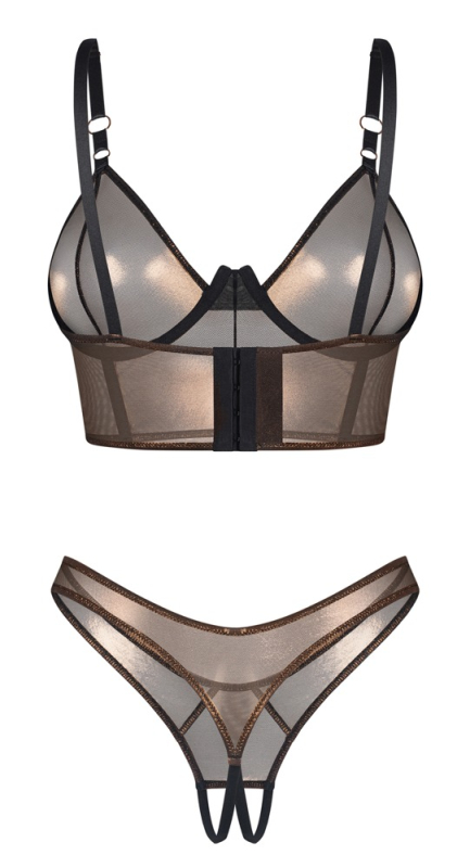 Glow-Look in schimmerndem Bronze! Set Soranna von Obsessive mit Bügel-BH und Riostring ouvert. In bronzefarbener Semitransparenz mit edlem Schimmer. Schwarze Details setzen stylische Akzente. Rundum elastisch und weich anschmiegsam für besten Tragekomfort. Etwas länger geschnittener Bügel-BH mit passend verstellbaren Trägern und verstellbarem Hakenverschluss im Rücken. Der Riostring ist im Schritt verführerisch offen.