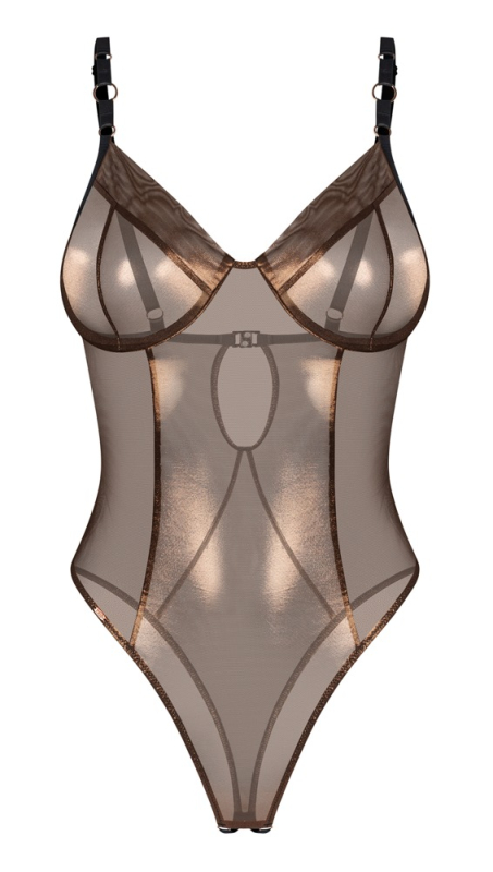 Glow-Look in schimmerndem Bronze! Body ouvert Soranna von Obsessive im knappen Rio-Style mit hohen Beinausschnitten. In bronzefarbener Semitransparenz mit edlem Schimmer. Schwarze Details setzen stylische Akzente. Rundum elastisch und weich anschmiegsam für besten Tragekomfort. Mit Bügel-Cups und kleinem Verschluss im Rücken. Die schwarzen Träger sind passend verstellbar. Im Schritt verführerisch offen.