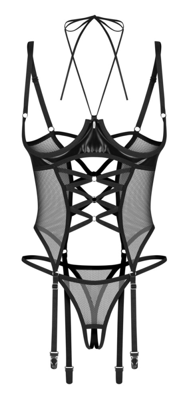 Sinnlichkeit gewagt inszeniert! Busenfreies Strapshemd Dominna von Obsessive inklusive String ouvert. Im stylischen Mix aus weichem feinem Netz und stilvollem Wetlook. Vorne und im freien Rücken mit dekorativer Zierschnürung. Der schmale Neckholder ist zum Binden. Zwischen den offenen Cups mit kleinem Schmuckelement. Die Träger und die beiden Strumpfhalter vorne sind passend verstellbar. Der verführerische schrittoffene String komplettiert das aufregende Ouvert-Duo.