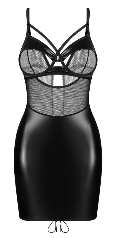 Sinnlichkeit gewagt inszeniert! Figurbetonendes Negligé und passender String im schwarzen Set Dominna von Obsessive. Im stylischen Mix aus feinem transparenten Netz (Top) und stilvollem blickdichtem Wetlook (Rock). Alles weich und elastisch für vollen Tragekomfort. Negligé mit extravaganten Bügel-Cups und Hakenverschluss hinten gearbeitet. Zwischen den Cups mit kleinem Schmuckelement. Im Rücken eine offene Zierschnürung bis runter zum Saum. Die Träger sind passend verstellbar. Der dazu passende String komplettiert den verführerischen Look.