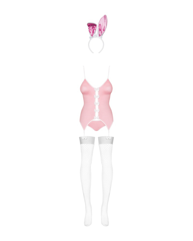 Sexy Häschen! Kostüm-Set Bunny von Obsessive in Rosé und Weiß. Bestehend aus Strapshemd und Netzstrümpfen, Hasenohren-Haarreif sowie Slip mit Puschelschwänzchen hinten. Elastisches weiches Strapshemd mit offener Schleifen-Front und verstellbarer Schnürung im freien Rücken. Die Strumpfhalter sind mit kleinen Schleifen verziert.
