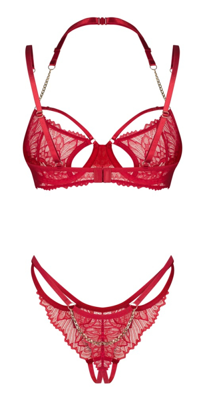 Set Matildea von Obsessive mit Bügel-BH und Riostring ouvert. Verführerischer Style in tiefem Rot mit feiner Spitze und goldfarbenen Schmuckdetails. Weich und elastisch für hohen Tragekomfort. Bügel-BH mit Kettchen an den verstellbaren Trägern und am dekorativen, verstell- und abnehmbarem Neckholder. Auch die oberen Cup-Riemchen sind passend verstellbar. Der schrittoffene Riostring verführt mit einem Kettchen über dem Po und kleinem Schmuckdetail in der Front.