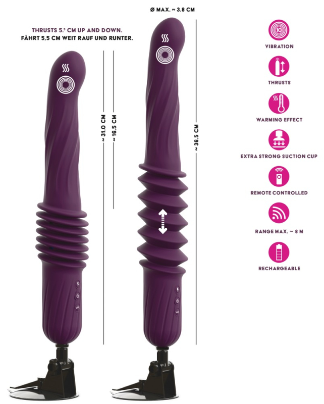 Die Stöße des Vibrators über eine Hublänge von 5,5 cm sind in 3 Geschwindigkeiten steuerbar. Die Vibrationen in 10 verschiedenen Modi. Alles bequem per Fernbedienung (Reichweite 8 Meter) oder per Knopfdruck direkt am Toy – getrennt oder miteinander kombiniert. Noch mehr Genuss bietet die wohltuende Wärmefunktion bis zu 42°C. Sie erwärmt schnell das seidig-weiche Silikon für besonders geschmeidiges Gleiten und intensives Empfinden.