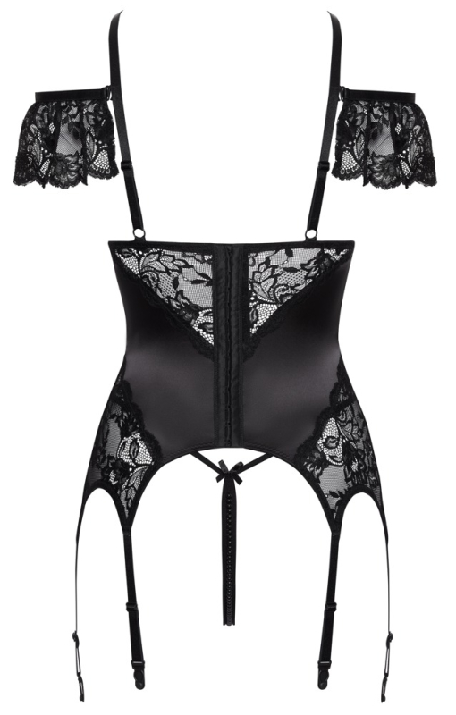 Strapshemd und String ouvert im Set von Cottelli LINGERIE. Schwarzer Satinglanz im Mix mit feiner Spitze und verziert mit kleinen Schleifchen. Rundum weich und elastisch für vollen Tragekomfort. Zwischen den geschlitzten Cups mit dekorativen, abnehmbaren Perlenketten. Auch die kleinen Spitzen-Ärmel sind vom Strapshemd abnehmbar. Die Träger und die insgesamt 6 Strumpfhalter sind passend verstellbar, genauso wie der 2fache-Hakenverschluss im Rücken. Der kleine String ist im Schritt offen und verführt zusätzlich mit einer stimulierenden Perlenkette, die auch abgenommen werden kann.
