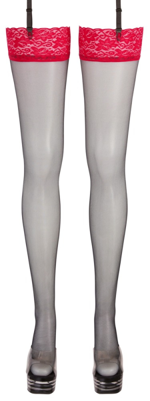 Sinnliche Straps-Strümpfe mit rotem Spitzenabschluss zum Anclipsen. 20 den. Leicht vorgeformter Fuß. Oeko-Tex zertifiziert.
