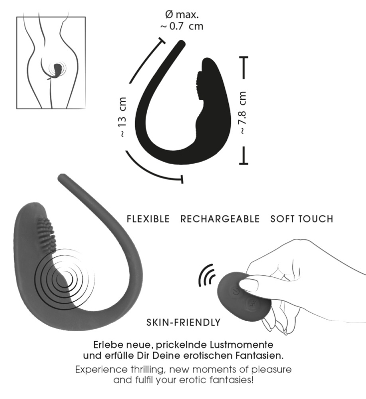 7 leise Vibrationsmodi sind mit der Fernbedienung bequem steuerbar – auch von dem/der Partner:in. Die Vibrationen übertragen sich optimal verteilt auf die Klitoris-Stimulationsnoppen, den ausgeprägt gerillten Vulvahügel und den schmalen Anus/Damm-Stimulator, um rundum zu verwöhnen.