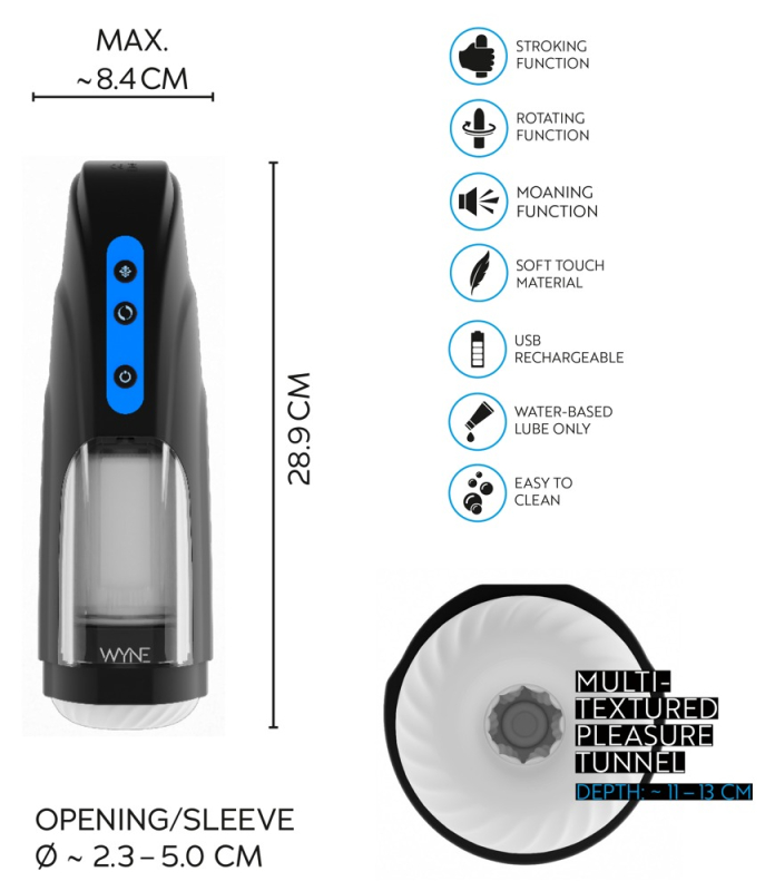 Intensives Vergnügen mit sexy Stöhnen! Leistungsstarker Masturbator 09 von WYNE, der den Penis in der sich Auf-und-Ab-bewegenden, aufregend rotierenden Innensleeve rundherum verwöhnt. Sexy gehauchtes Stöhnen per beiliegender Kopfhörer sorgt dabei für stimmungsvolle Untermalung. Einfach nur zurücklehnen und genießen!